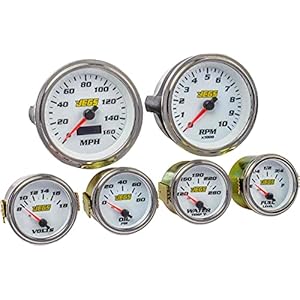 JEGS 6-Gauge Kit | White Analog Face | 0-90 Ohms 2-1/16 “ Fuel Level Gauge | 3-3/8″ Speedometer & Tachometer, 2-1/16″ Voltmeter, Water Temperature, and Oil Pressure Gauges